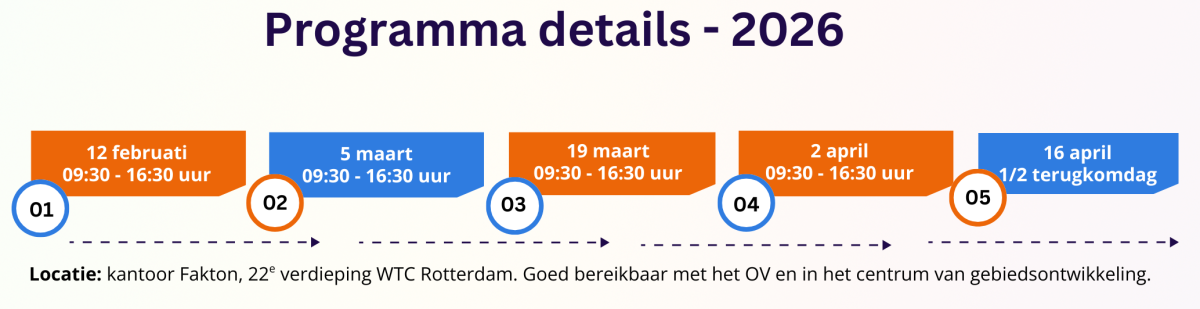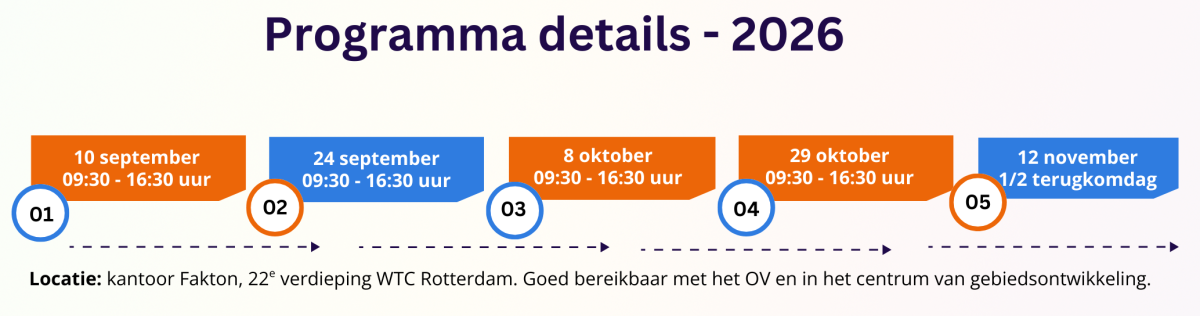Wil je groeien in je rol, meer grip krijgen op de waardeketen en echt begrijpen hoe projecten financieel en strategisch in elkaar zitten? Vraag vrijblijvend meer informatie aan of schrijf je direct in. Dit is jouw kans om in korte tijd grote stappen te zetten in je vastgoedcarrière.