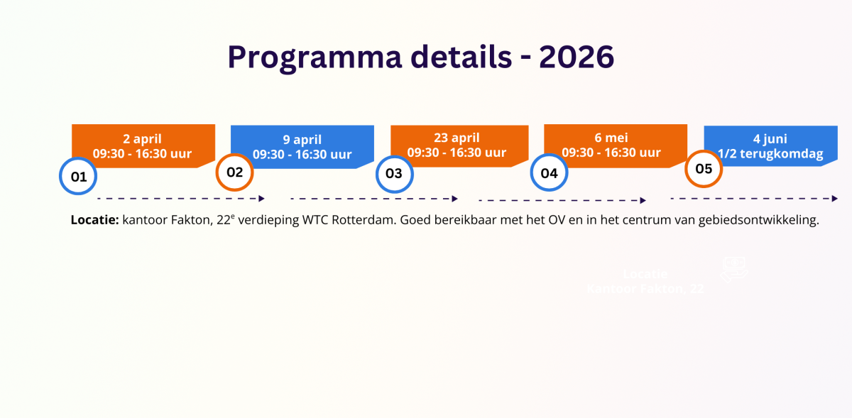 Wil je groeien in je rol, meer grip krijgen op de waardeketen en echt begrijpen hoe projecten financieel en strategisch in elkaar zitten? Vraag vrijblijvend meer informatie aan of schrijf je direct in. Dit is jouw kans om in korte tijd grote stappen te zetten in je vastgoedcarrière.